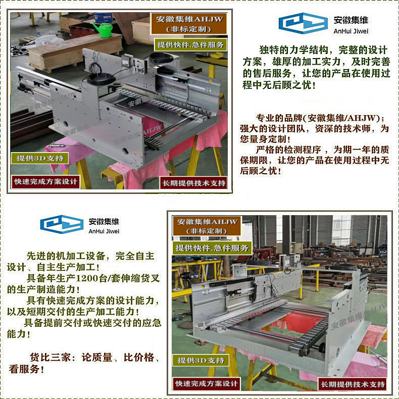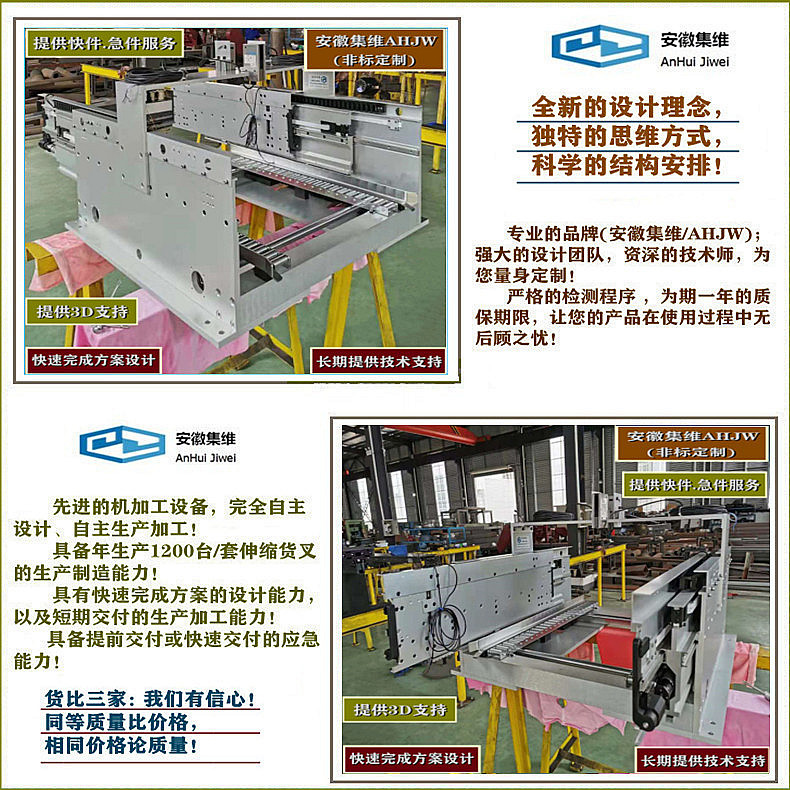 安徽集維智能裝備有限公司是一家集研發、設計、生產、銷售為一體的堆垛機伸縮貨叉生產制造企業,擁有多位資歷深厚的工程設計團隊和經驗豐富的技術師,全套的機加工設備,完全自主設計、自主生產,具備年生產1200臺套伸縮貨叉的制造能力,具有快速完成方案的設計能力,以及短期交付的生產加工能力,具備提前交付或快速交付的應急能力!